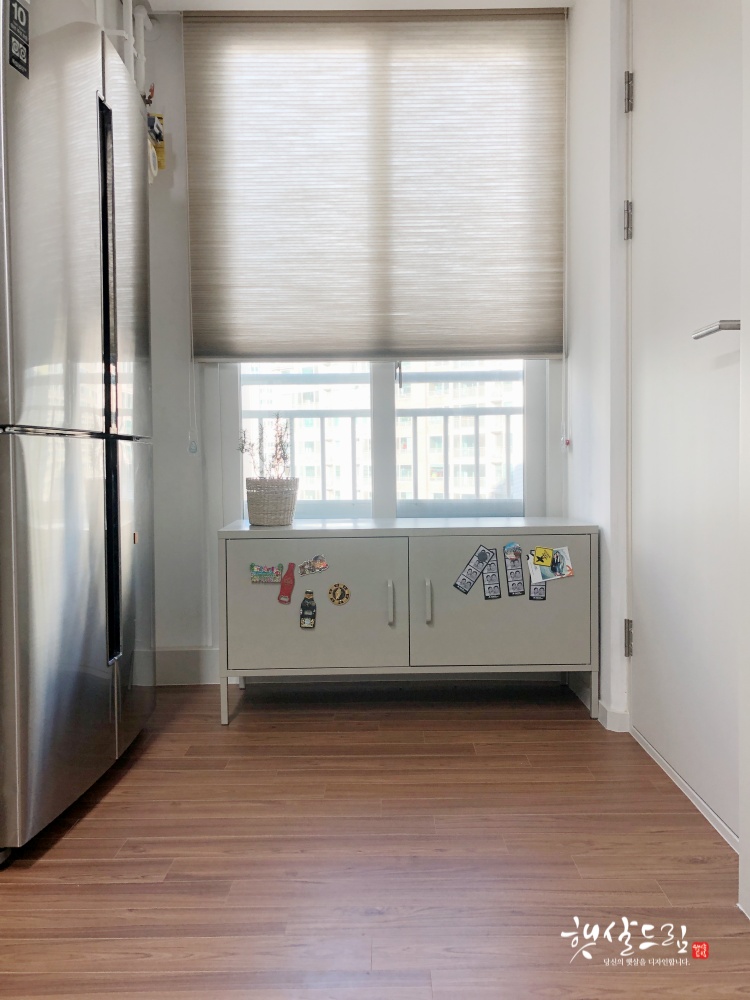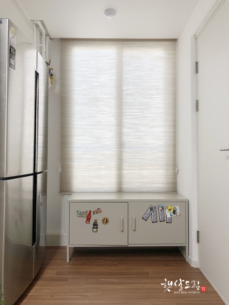 마지막으로 주방의 긴 창도 베이지톤의 허니콤블라인드