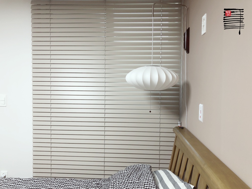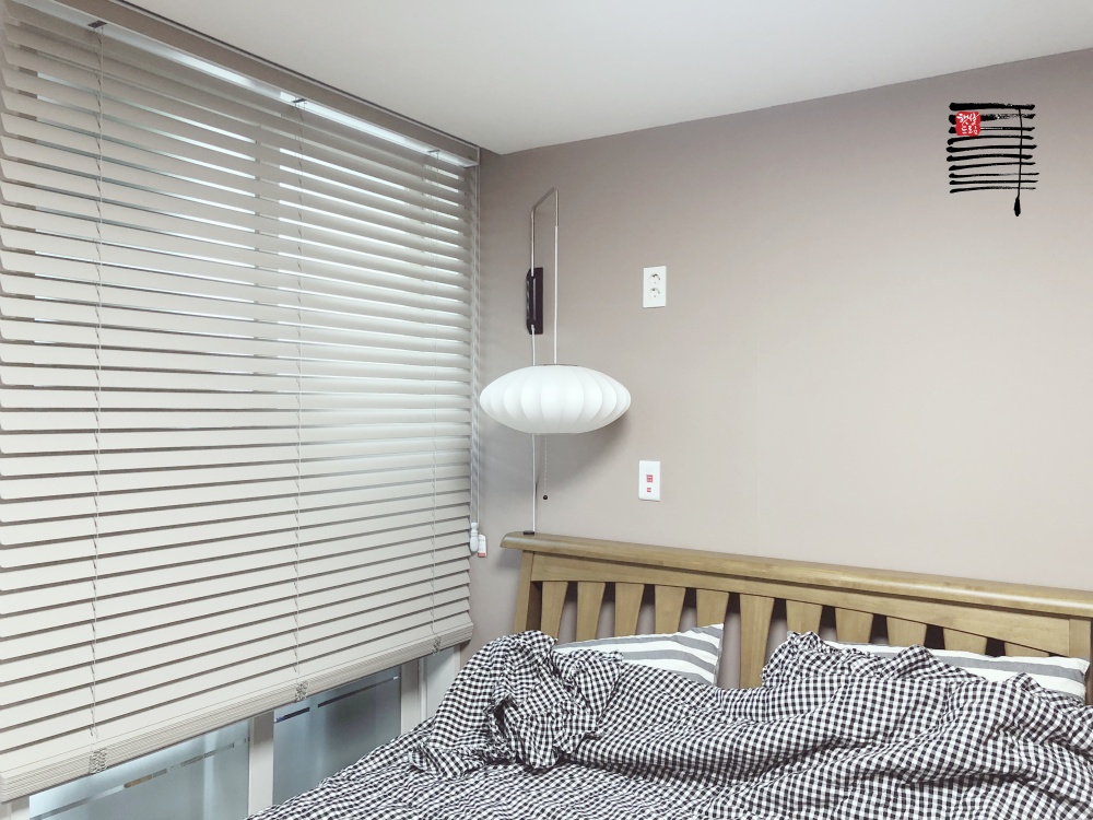 베이지톤의 문과 포인트 벽지와 정말 잘 어울리죠? 기능적으로도 패브릭 제품이 많은 침실에 관리나 청소가 편리한 블라인드를 선택한 건 정말 좋은 선택이었던 것 같아요  또 포인트가 될 조명과 함께하니 더 완벽한 조화처럼 느껴지네요