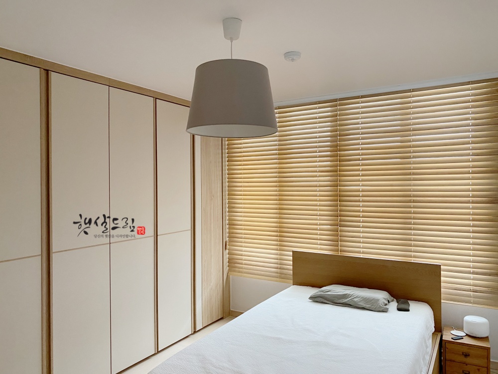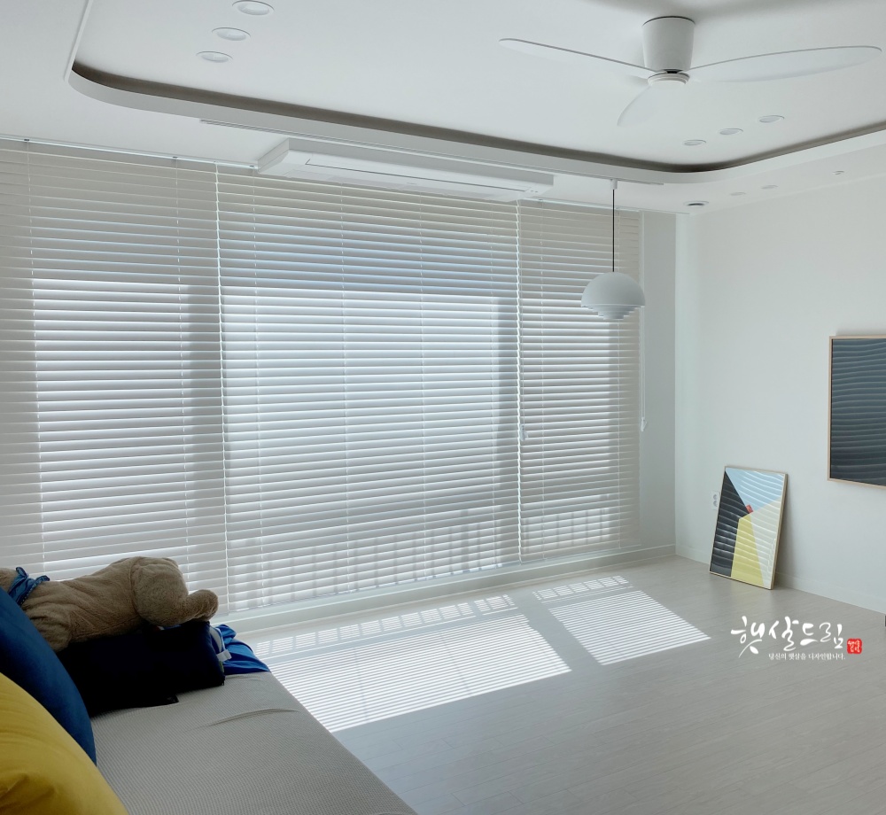 화이트 우드블라인드는 깔끔하고 시원한 해운대와 닮았어요 햇살은 조절하면서 창밖 풍경은 그대로 우리 집 그림이 되니까 차가워 보이는 아파트에서도 따뜻한 자연을 가져다 인테리어 할 수 있다는 장점이 있습니다.