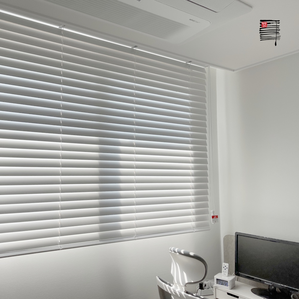 느낌은 화이트 우드블라인드와 비슷하지만 폭이 1/2로 적어 좀 더 미니멀한 느낌이 들고 우드 블라인드보다 가벼워 더욱 쉽게 조작할 수 있다는 장점이 있습니다.