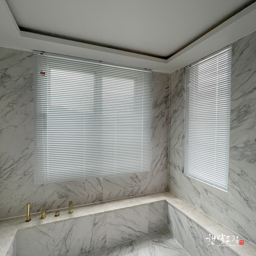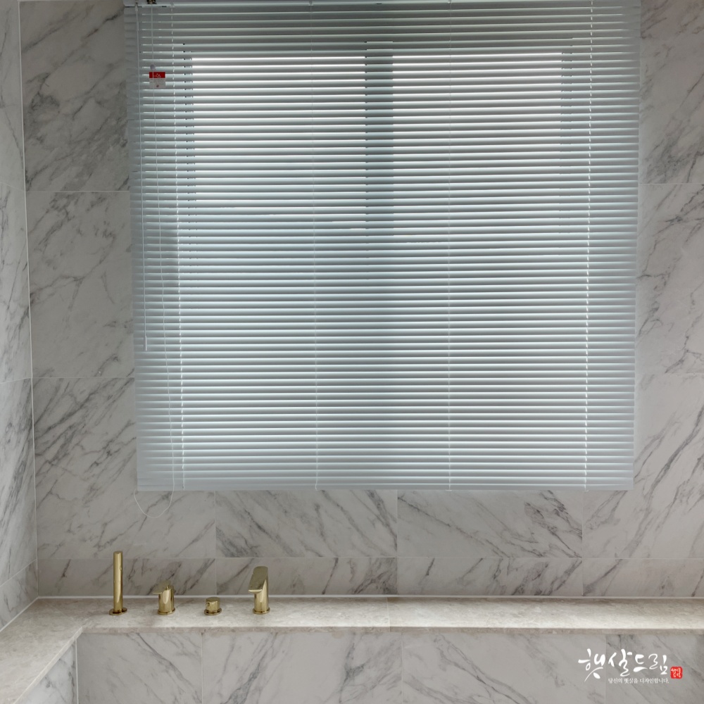여기는 욕조가 있는 욕실입니다. 큰 욕조만큼 화장실에 큰 창이 있는데 이런 공간에도 알루미늄 블라인드는 정말 실용적으로 사용할 수 있습니다. 만약 다른 블라인드라면 곰팡이나 습기로 걱정이 되겠지만 알루미늄 블라인드는 그런 걱정은 필요 없답니다. 뿐만 아니라 슬랫의 각도를 조절하여 외부의 시선은 차단하고 내부에서는 외부를 볼 수 있다는 장점도 있습니다.