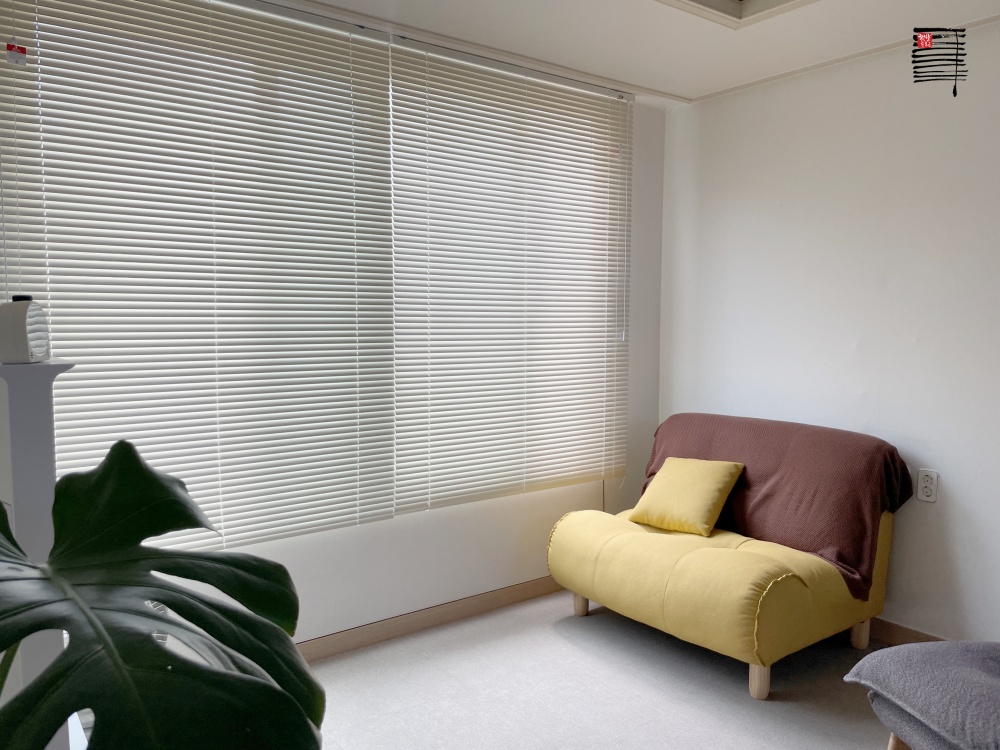 알루미늄 블라인드는 25mm, 35mm, 50mm 다양한 종류지만 가장 얇은 25mm를 가장 많이 사용하시고 한 줄로 작동하는 방식보다는 빠르게 오르고 내릴 수 있는 코드락 방식을 많이 선호합니다.