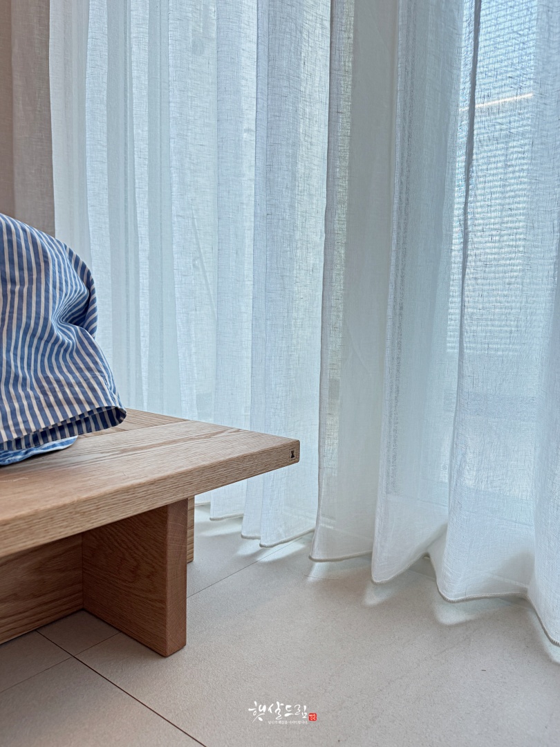 린넨 자체의 자연스러운 질감과 통기성에 수입 원단이 주는 고급스러움이 더해져 공간에 깊이를 더해주고 차분한 분위기를 연출하기에 좋습니다. 특히 린넨 원단에 빛이 투과될 때 더욱 부드럽고 자연스러운 구김으로 은은한 감성을 제대로 느낄 수 있고, 린넨의 원단마다 미묘하게 다른 질감과 두께, 색상, 드레이프성을 가져 공간 분위기에 맞게 선택할 수 있답니다.
